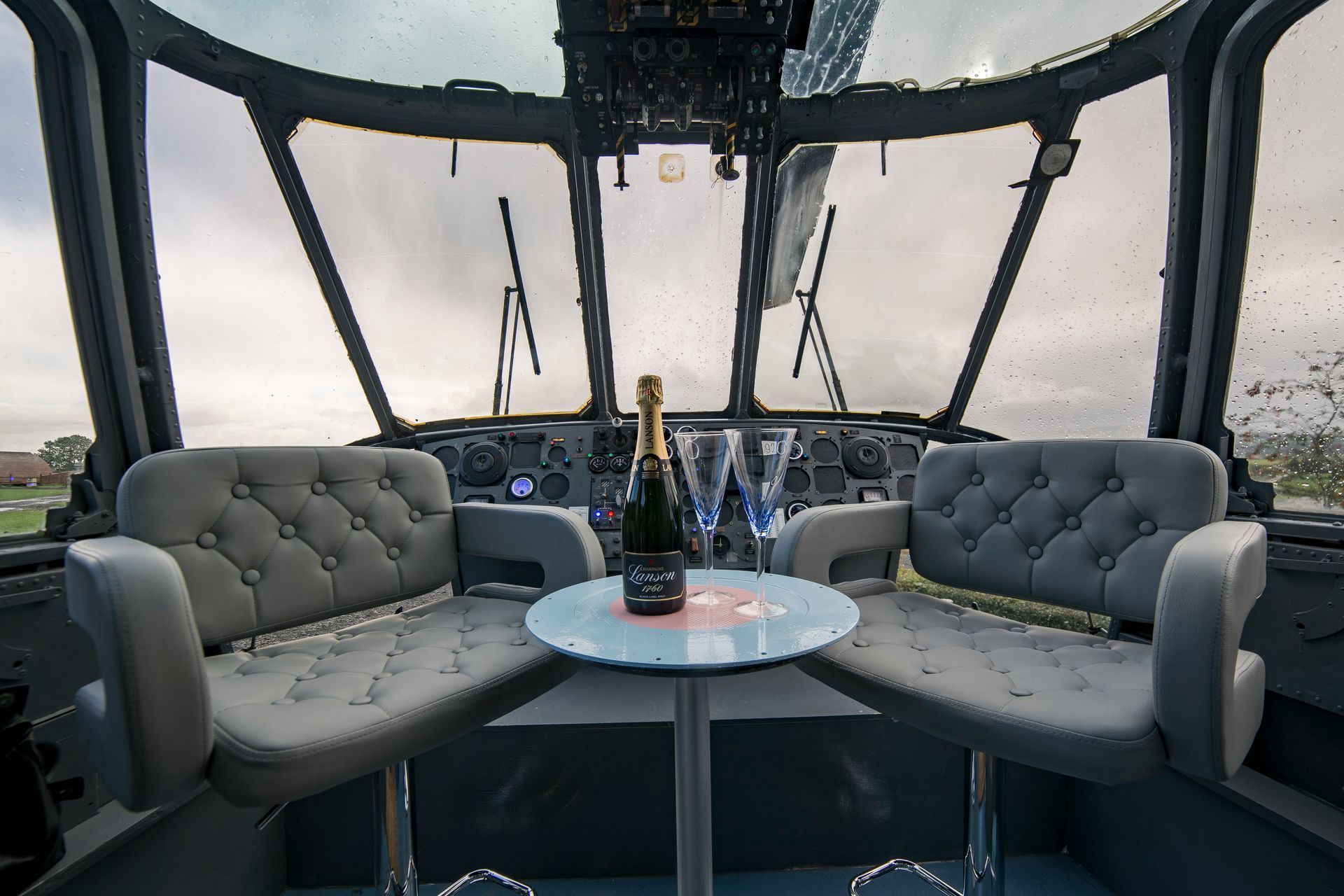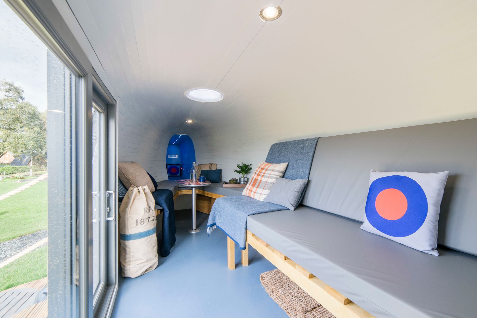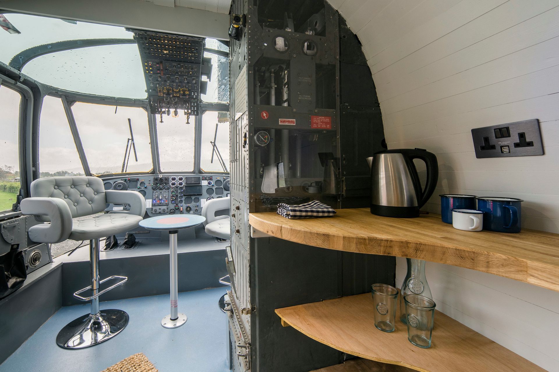 The real focal point of the interior however is the cockpit where you can enjoy spectacular panoramic views over the Carse of Stirling. The flight deck has been refitted with swivel seats and a table made from an old fuel tank cover and painted with an RAF roundel.