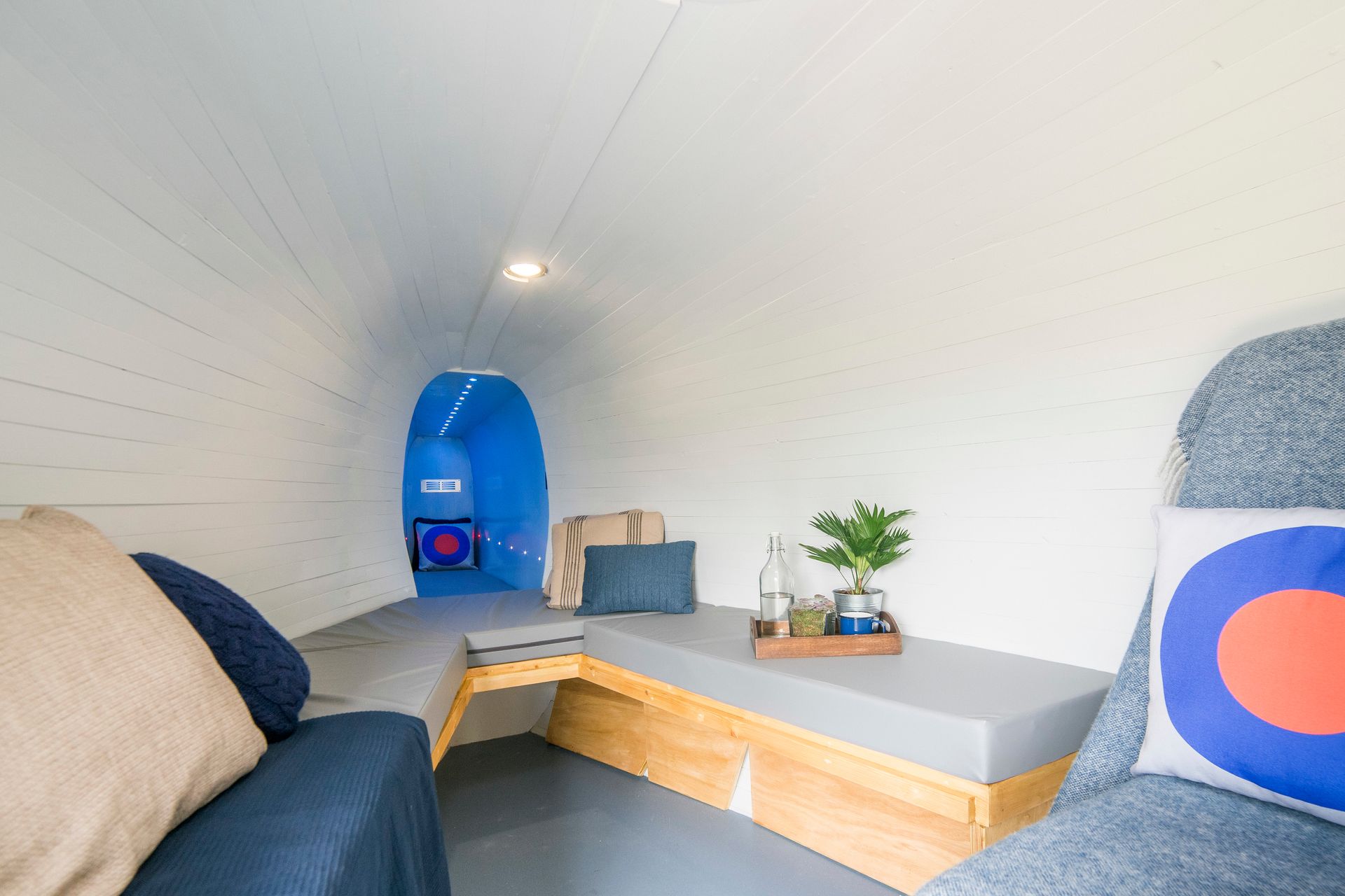 Inside, we’ve retained many of the Sea King’s original features but have with removed the bulky sonar station, which was donated to The Helicopter Museum in Weston-Super-Mare, to make way for a shower room and mini-kitchen.