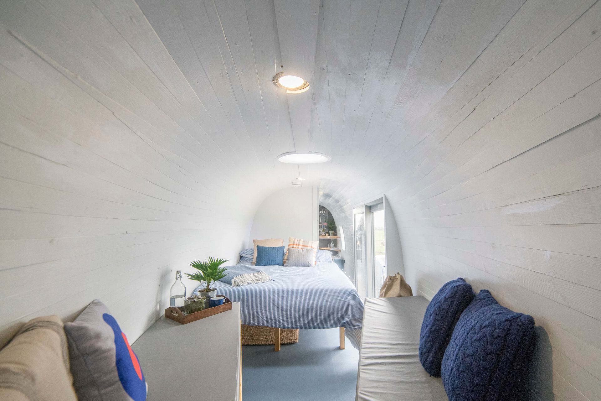 Meanwhile, we’ve transformed her spacious interior into a remarkable holiday home that sleeps a family of five (2 adults and 3 children) with a double and a triple bed as well as single bed in the tail. To make sure the helicopter is cool in summer and warm in winter, the curved walls have been insulated, wood panelled and painted which gives the inside the look of an upturned hull of a boat.